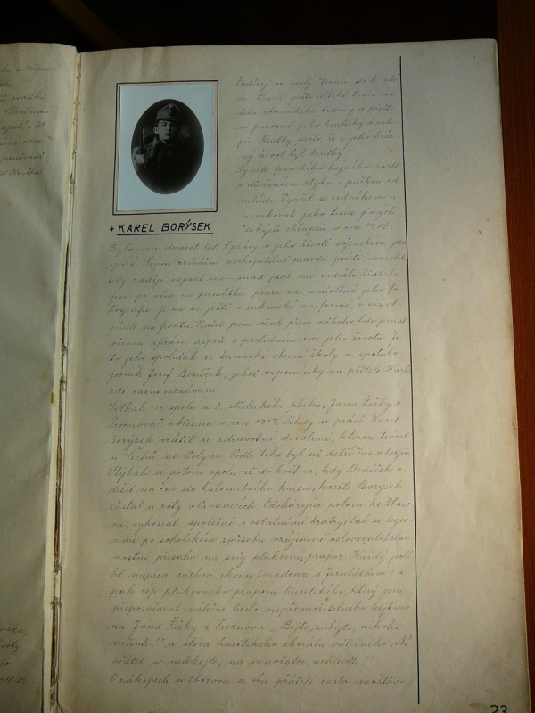 Dva z nich, zedník Karel Borýsek a učitel Karel Hruška, položili svůj život za vlast. Vylíčím v této kronice životy všech těchto mužů, zvláště jejich účast v bojích za svobodu naší vlasti. Jejich životopisy najde čtenář v l . 1918-20. Zadívej se, milý čtenáři, do té mladé, téměř ještě dětské tváře našeho zborovského hrdiny a přečti si pozorně jeho kratičký životopis. Krátký proto, že i jeho krásný život byl krátký.