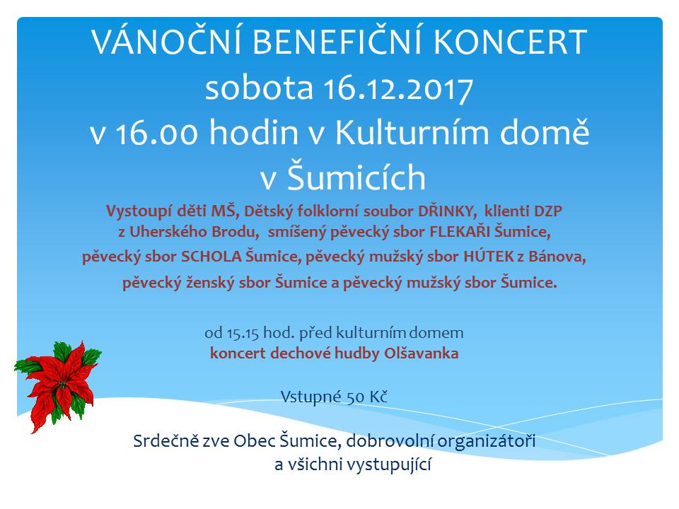 V sobotu 16.12.2017 zve Obec Šumice na Vánoční benefiční koncert. Od 15.15 hod. proběhne před kulturním domem koncert dechové hudby Olšavanka. Od 16.00 hod. vystoupí v kulturním domě děti MŠ, Dětský folklorní soubor DŘINKY, klienti DZP z Uherského Brodu, smíšený pěvecký sbor FLEKAŘI Šumice, pěvecký sbor SCHOLA Šumice, pěvecký mužský sbor HÚTEK z Bánova, pěvecký ženský sbor Šumice a pěvecký mužský sbor Šumice. Vstupné je 50 Kč.