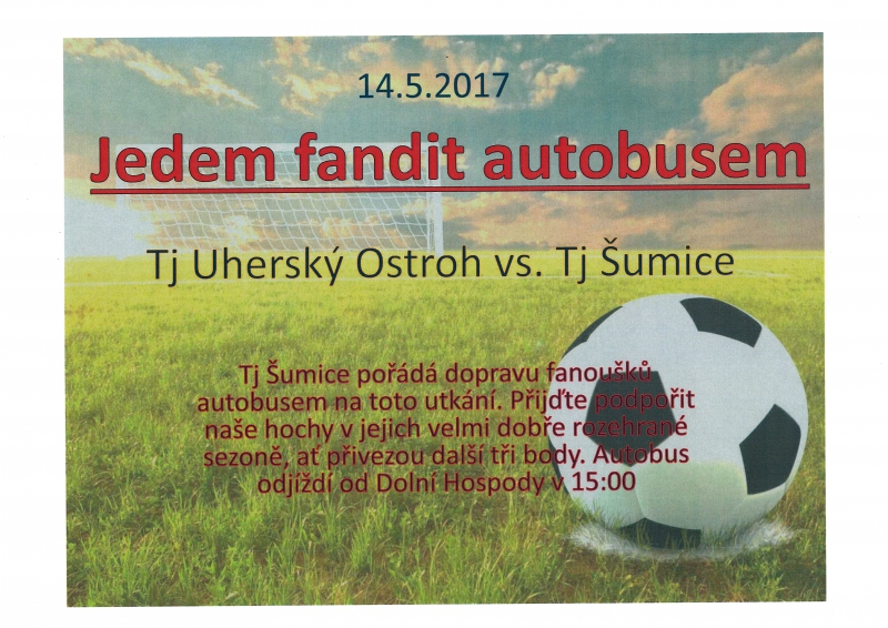 TJ Šumice pořádá v neděli 14. 5. 2017 dopravu fanoušků autobusem na fotbalové utkání TJ Uherský Ostroh - TJ Šumice.