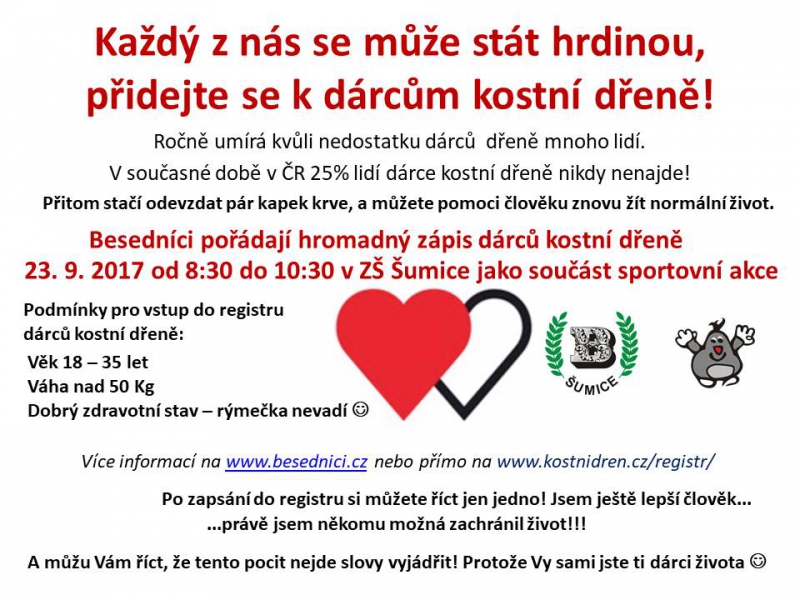 NEVÁHEJTE! Dojděte v sobotu 23. 9. 2017 mezi 8:30 až 10:30 do ZŠ Šumice dát pár kapek Vaší krve. Bude na Vás čekat zdravotnický personál transfuzního centra Uherskohradišťské nemocnice, pod vedením Mudr. Orlovské, která Vám zodpoví veškeré dotazy ohledně dárcovství kostní dřeně.