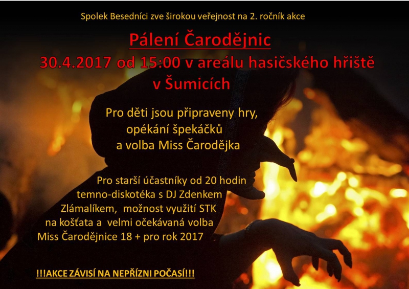 Spolek Besedníci pořádá v neděli 30.4.2017 druhý ročník "Pálení čarodějnic". Akce se uskuteční na hasičském hřišti od 15.00 hod. Pro děti je připraven zábavný program v podobě různých soutěží, vyhlášení Miss Čarodějnice 2017 a následné pálení čarodějnic. Každé dítě dostane jako dárek špekáček k opečení zdarma. Ve večerních hodinách se bude konat pro starší účastníky diskotéka. Odpolednem a večerem bude provázet DJ Zdeněk Zlámalík. V PŘÍPADĚ ŠPATNÉHO POČASÍ SE AKCE RUŠÍ!