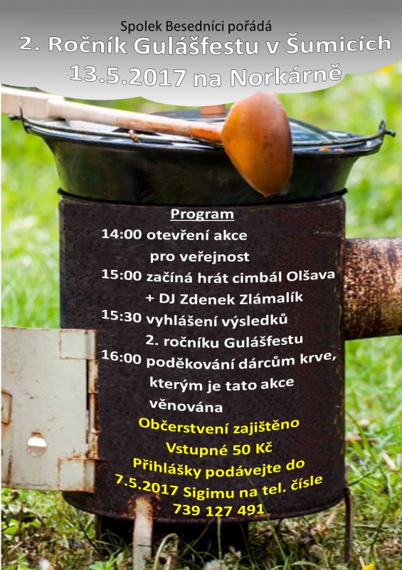 O dva týdny později, v sobotu 13.5.2017, pořádají Besedníci druhý ročník "Šumického Gulášfestu". Akce se uskuteční na Norkárně. Program akce je uveden v přiloženém plakátku. Soutěžící týmy se mohou přihlásit do 7.5.2017 u pana Dušana Miličky. Bližší informace získáte na tel. č. 739 127 491. Součástí přihlášky je i zápisné v hodnotě 300 Kč.