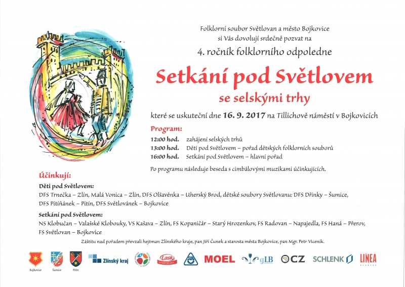 Folklorní soubor Světlovan a město Bojkovice si Vás dovolují srdečně pozvat na 4. ročník folklorního odpoledne SETKÁNÍ POD SVĚTLOVEM se selskými trhy, které se uskuteční dne 16. 9. 2017 na Tillichově náměstí v Bojkovicích.