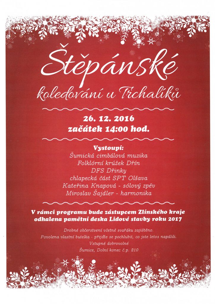 Pořadatelé srdečně zvou na "Štěpánské koledování u Trchalíků" dne 26. 12. 2017. Začátek je ve 14.00 hod. na Trchalíkově usedlosti v Šumicích, čp. 210.