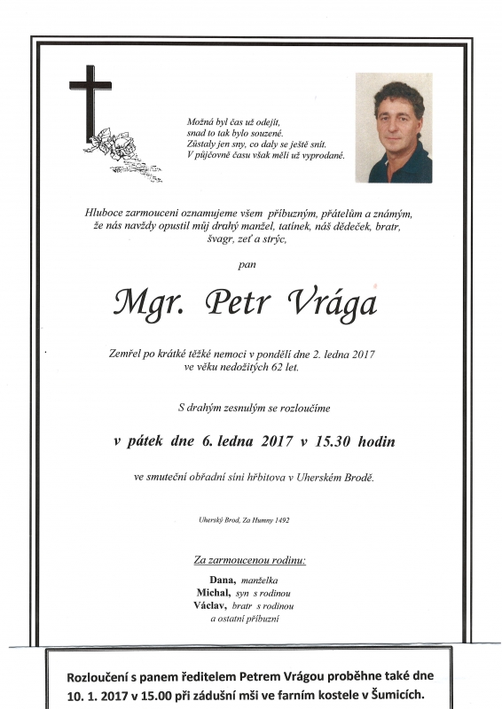 Mgr. Petr Vrága působil na šumické základní škole 35 let. Několik let i v Šumicích bydlel. Ředitelem ZŠ Šumice byl od 1.6.1990. Zemřel po krátké těžké nemoci 2. ledna 2017.