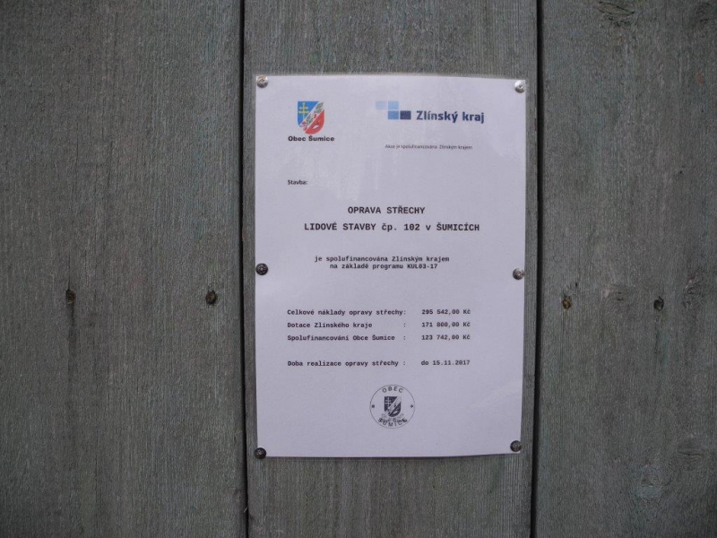 Ve Zlínském kraji je 306 obcí a měst, maximální výše podpory na jednoho příjemce je 200.000 Kč, podmínkou je finanční spoluúčast žadatele. Celková suma, kterou ZK naplánoval na program KUL03-17 v roce 2017, je 6 mil. Kč. To znamená, že ZK může finančně podpořit asi 30 projektů v 30 obcích. To je i případ naší stavby lidové architektury, obnova RD čp. 102 a dostavba stodoly v Šumicích. Obec požádala Zlínský kraj o spolufinancování opravy střechy čp. 102, zde je bilance:
