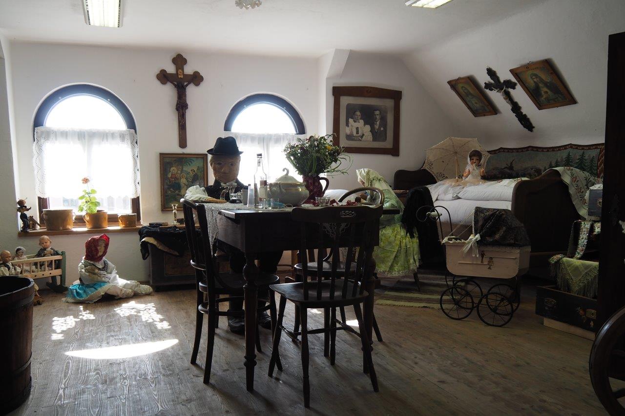 Nedělní odpoledne mohli návštěvníci šumických hodů využít k návštěvě obecních muzeí a také k návštěvě Trchalíkovy usedlosti na Dolním konci. V obecním muzeu nad poštou nastrojila paní Jana Živnéřová figury do lidových krojů a umístila je ke stolům, ke kolovratu a kolébce, nebo na dojičskou stoličku. Velice pěkné.