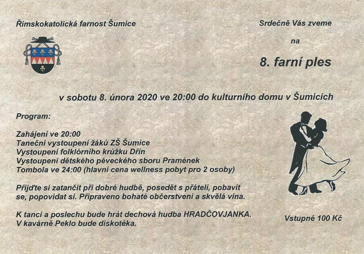 Římskokatolická farnost Šumice Vás srdečně zve na 8. farní ples, který se koná v sobotu 8. února 2020 v sále kulturního domu v Šumicích.