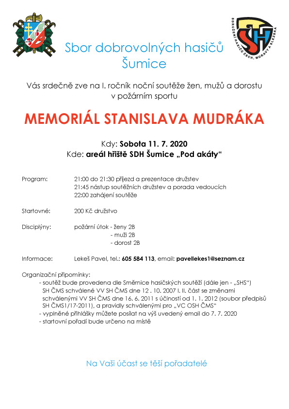 V sobotu 11.7.2020 bude od 13.00 hod. probíhat na hasičském hřišti Skalka soutěž mladých hasičů „O pohár starosty SDH Šumice“. Ve večerních hodinách od 22.00 hod. bude následovat 1. ročník noční soutěže mužů, žen a dorostu „Memoriál Stanislava Mudráka“.