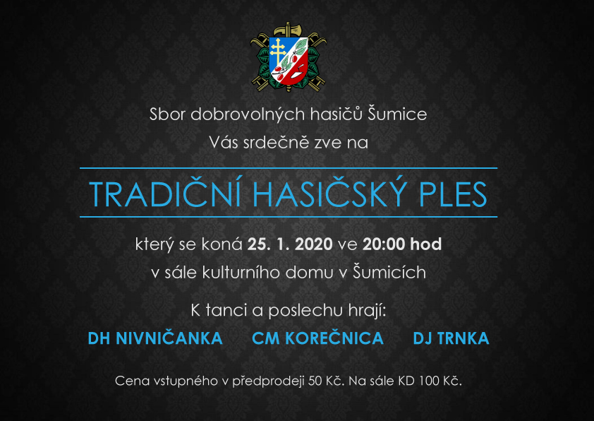 Sbor dobrovolných hasičů Šumice Vás zve na tradiční Hasičský ples, který se koná v sobotu 25. ledna 2020 ve 20.00 hod. v sále kulturního domu.