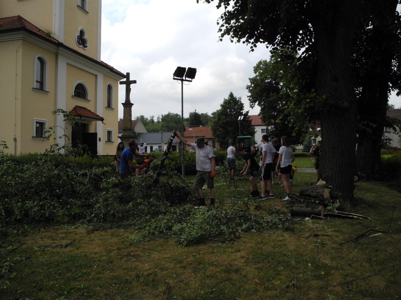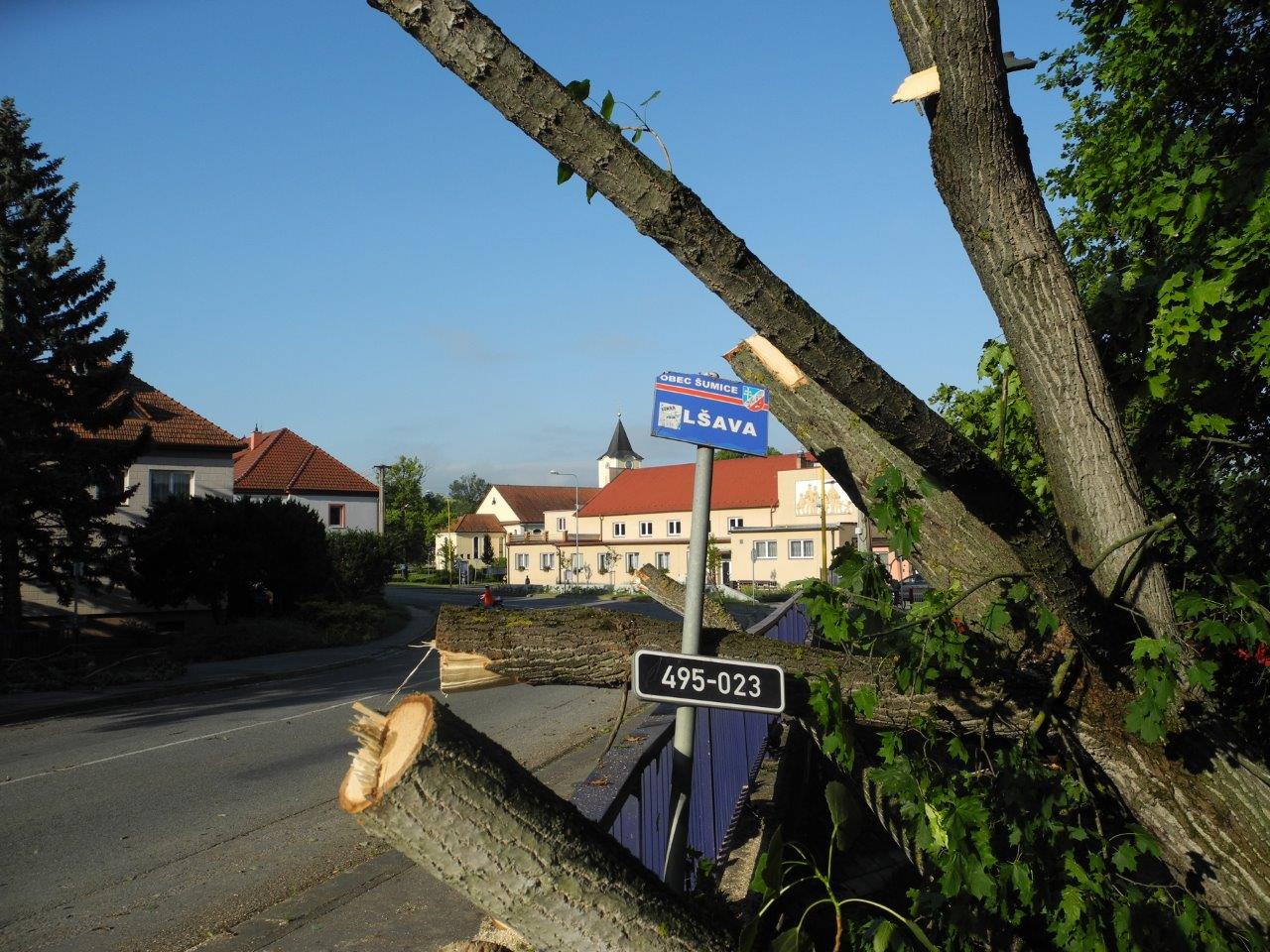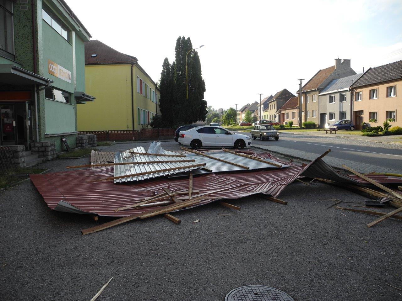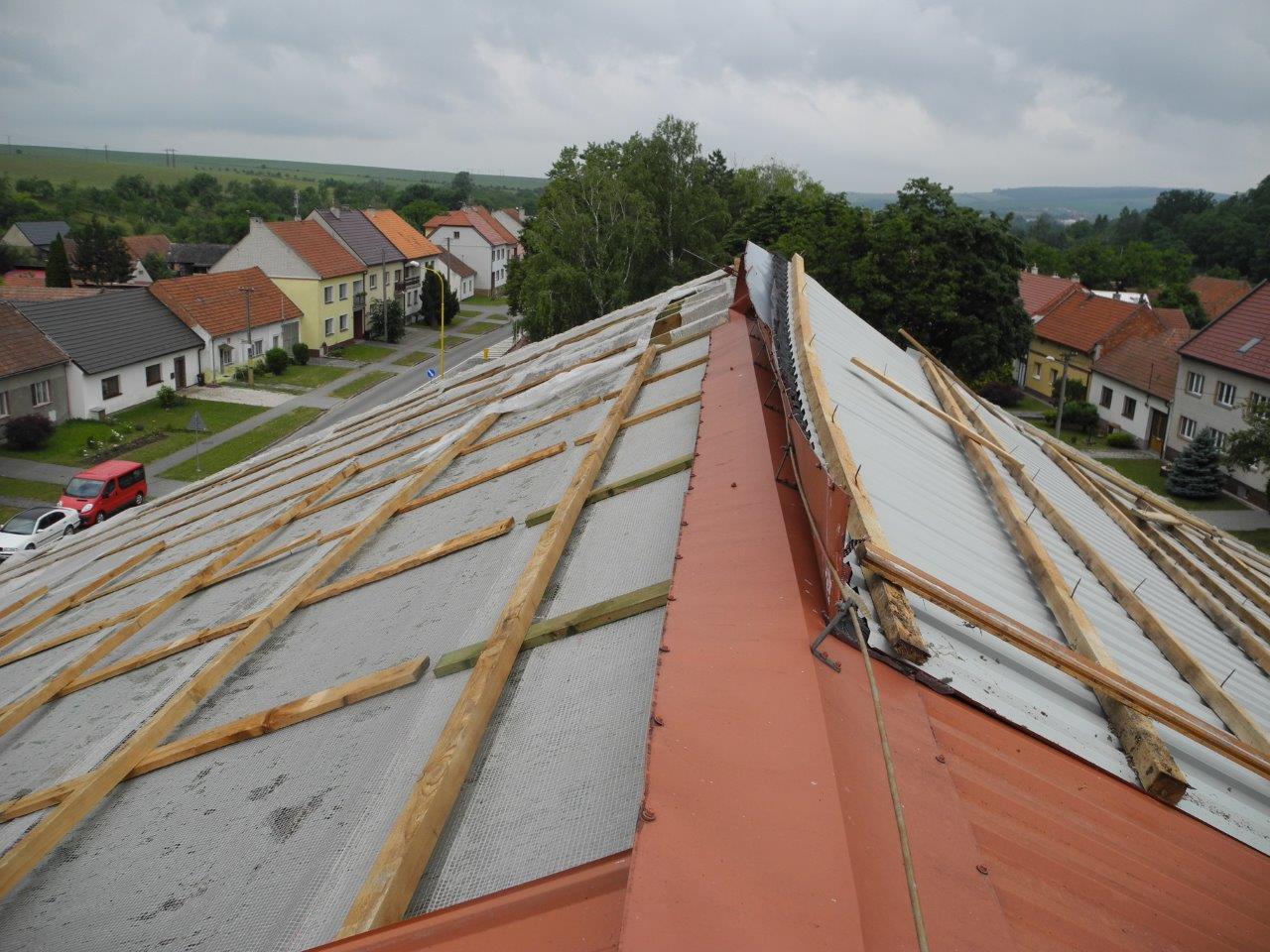Vichřice, kterou doprovázela bouřka s krupobitím obcházela naši obec až do 21:15 hodin. Asi po desetiminutové smršti jsme mohli bilancovat škody. Největší škodní událost je zničená střecha tělocvičny ZŠ . Z plochy 220 m2 byla zcela stržena střešní krytina z trapézových plechů. Krytina, která pod ostrým úhlem dopadla na silnici II/495 naštěstí nikoho nezranila. Provoz na silnici II/495 byl ochromen. Další překážkou silničního provozu byl rozložitý vyvrácený topol u železniční zastávky ležící na silnici. Hasiči řídili vysílačkami kyvadlovou dopravu a odstraňovali překážky ze silnice. Plné obnovení provozu nastalo až v 23:45 hodin. Lokálně byly poškozeny některé střechy, některé stromy v obci nápory větru nevydržely.
