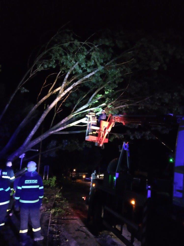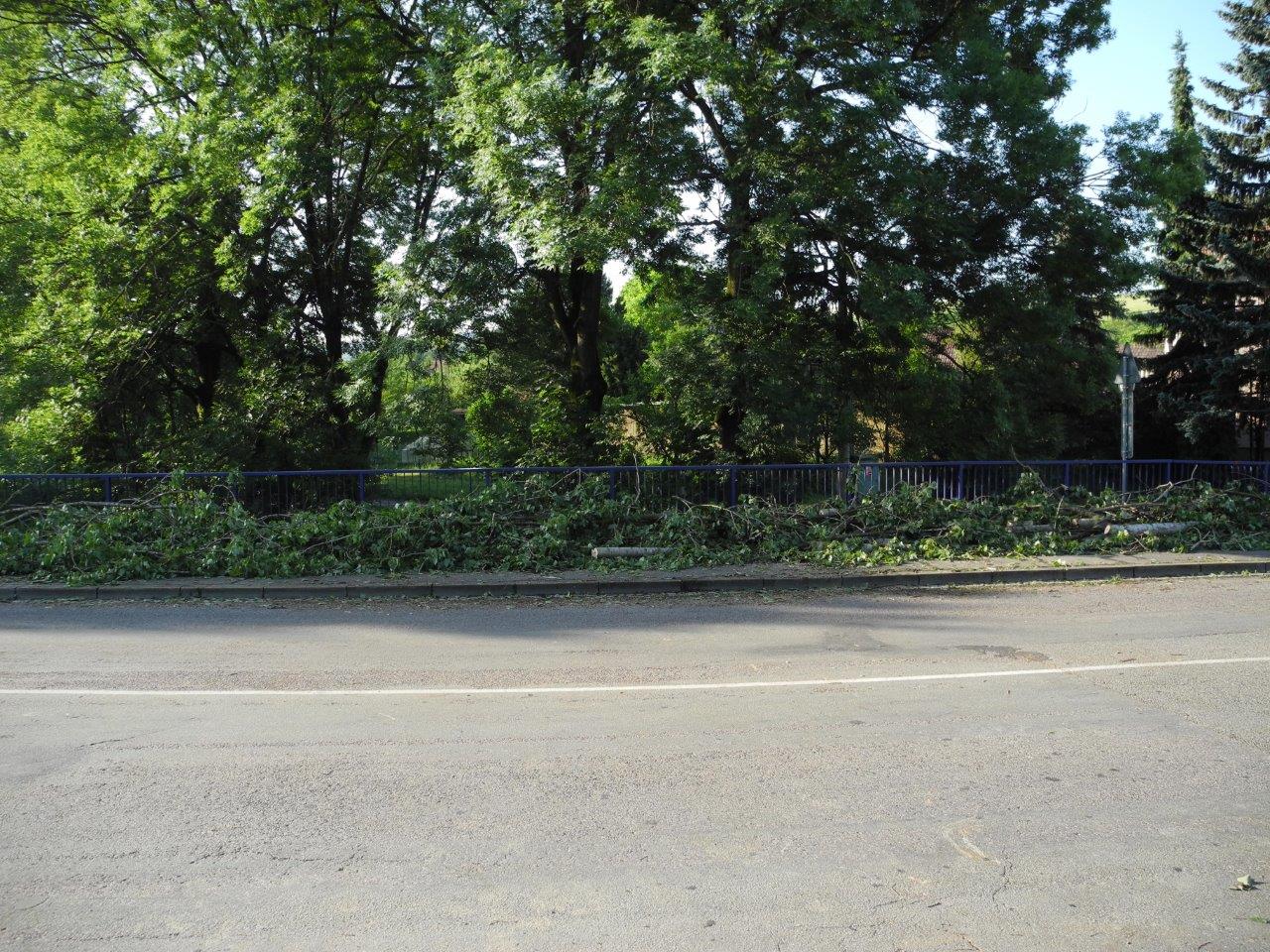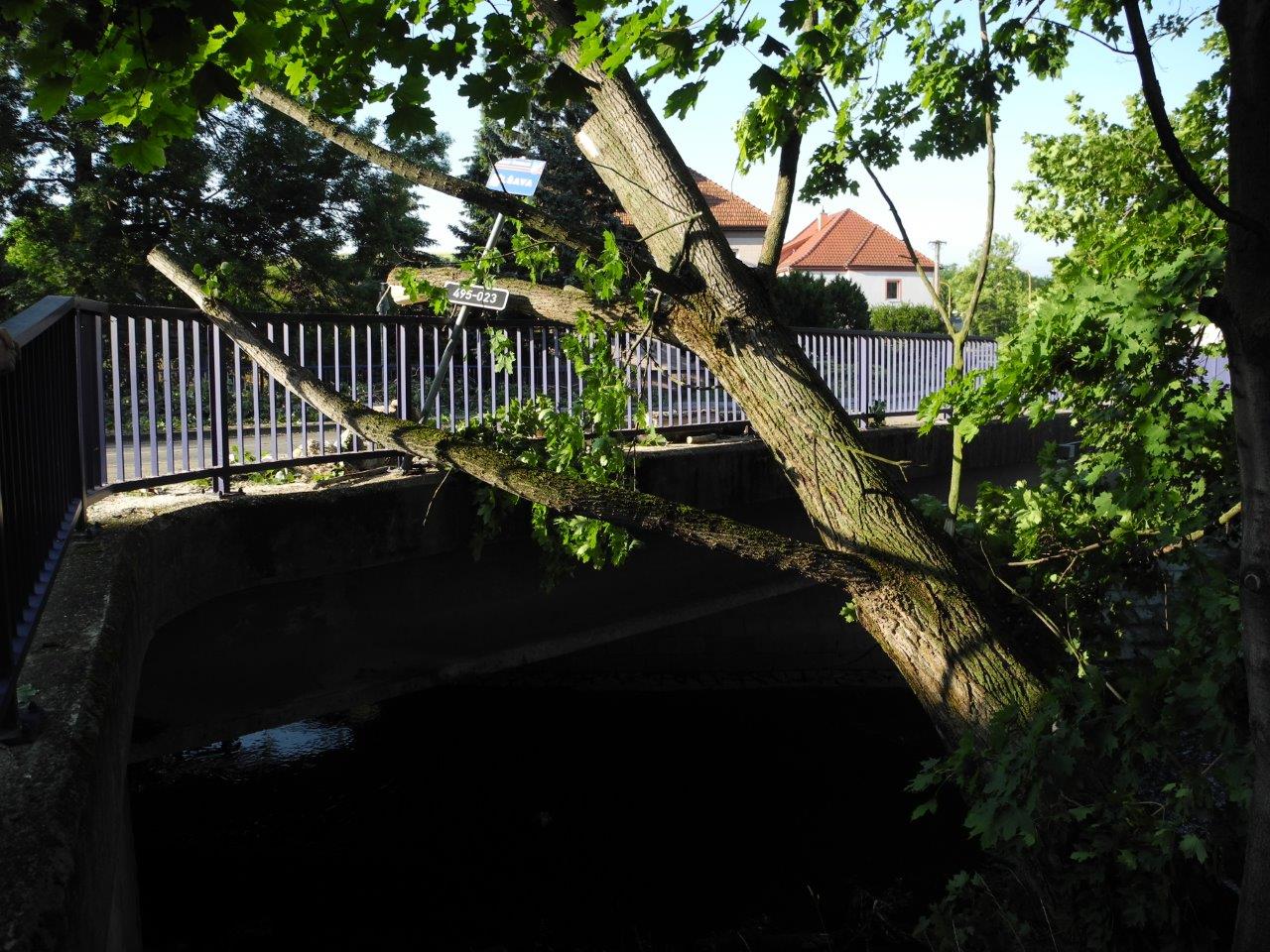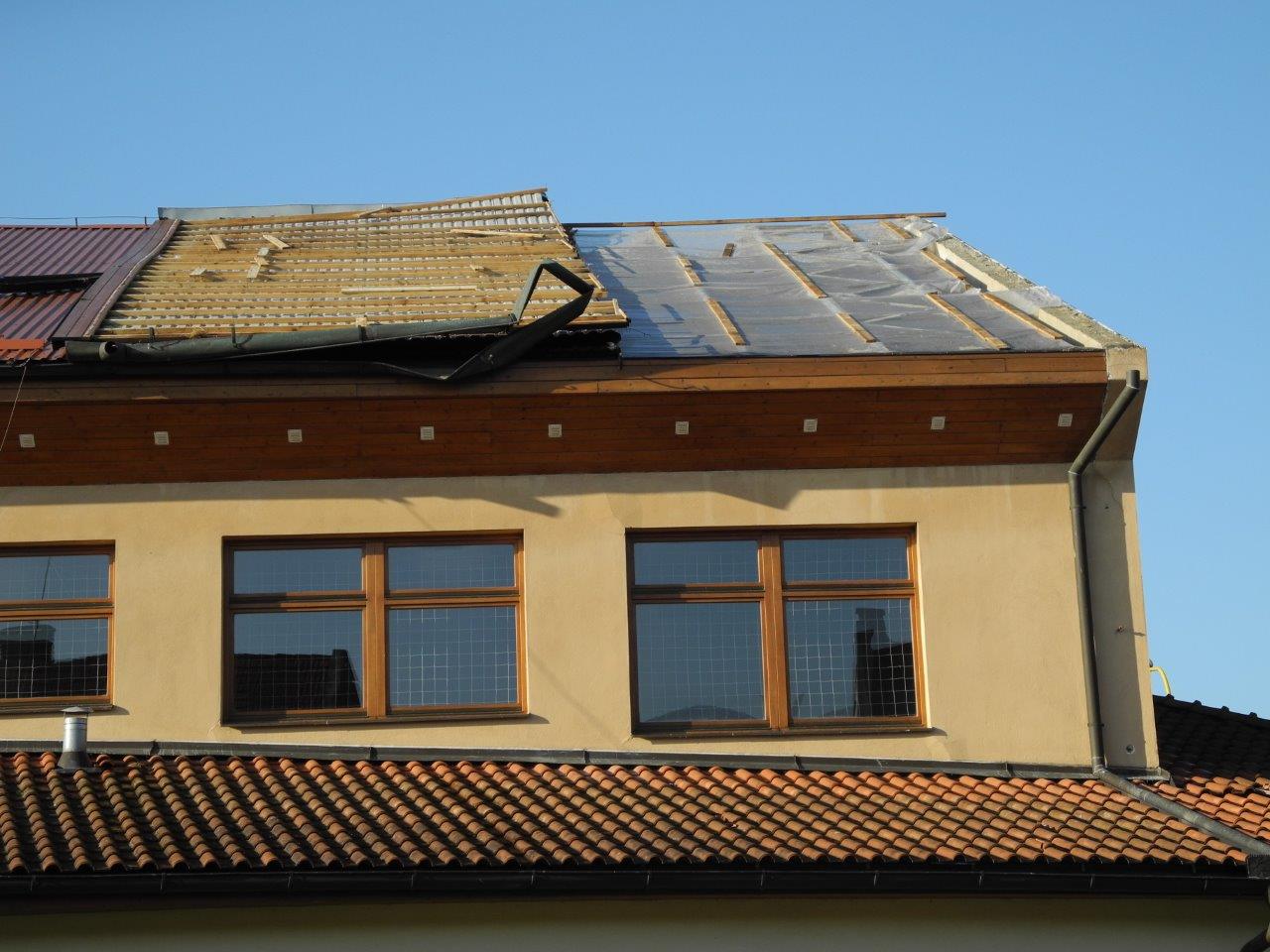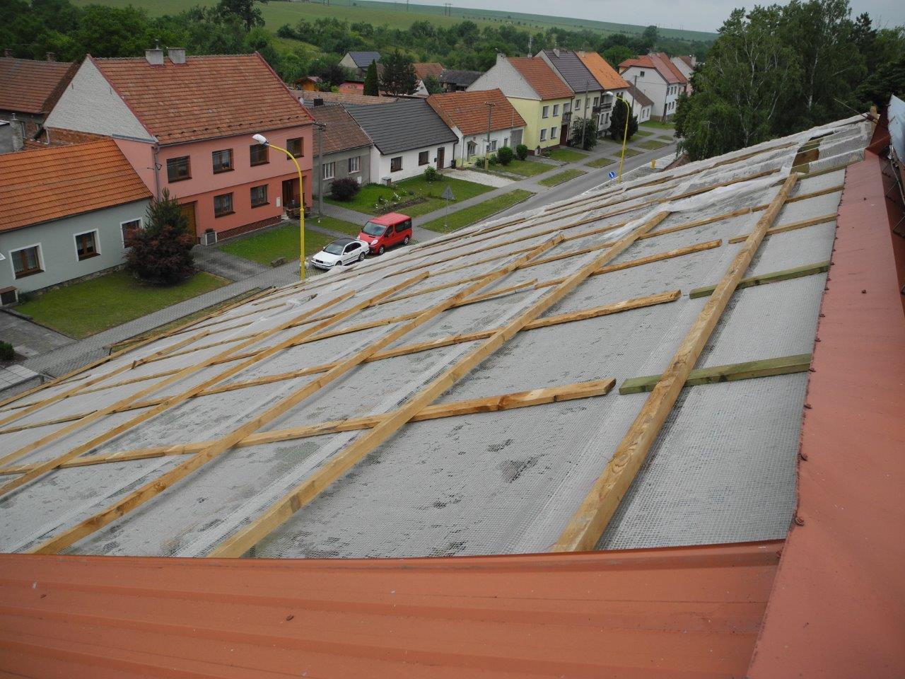 Vichřice, kterou doprovázela bouřka s krupobitím obcházela naši obec až do 21:15 hodin. Asi po desetiminutové smršti jsme mohli bilancovat škody. Největší škodní událost je zničená střecha tělocvičny ZŠ . Z plochy 220 m2 byla zcela stržena střešní krytina z trapézových plechů. Krytina, která pod ostrým úhlem dopadla na silnici II/495 naštěstí nikoho nezranila. Provoz na silnici II/495 byl ochromen. Další překážkou silničního provozu byl rozložitý vyvrácený topol u železniční zastávky ležící na silnici. Hasiči řídili vysílačkami kyvadlovou dopravu a odstraňovali překážky ze silnice. Plné obnovení provozu nastalo až v 23:45 hodin. Lokálně byly poškozeny některé střechy, některé stromy v obci nápory větru nevydržely.