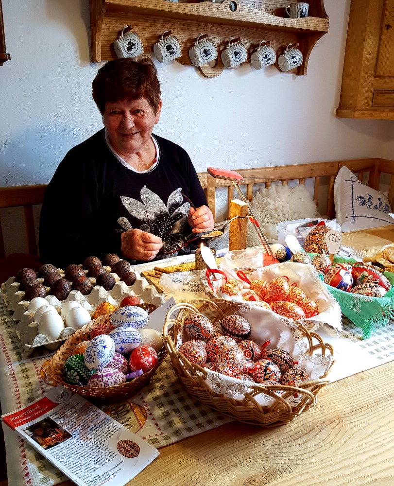 Ve výminku u praskajících kamen, za stolem, na němž se zlatově smálo tradiční postní jídlo Boží milostě, předváděla svůj um paní Marie Vlčková. Malérečka kraslic, držitelka celé řady ocenění, prezentovala tradiční batikované a zelové kraslice. Kdo měl odvahu, mohl pod jejím dohledem zkusit svůj um. Kuchyně praskala pod počtem návštěvníků ve švech.