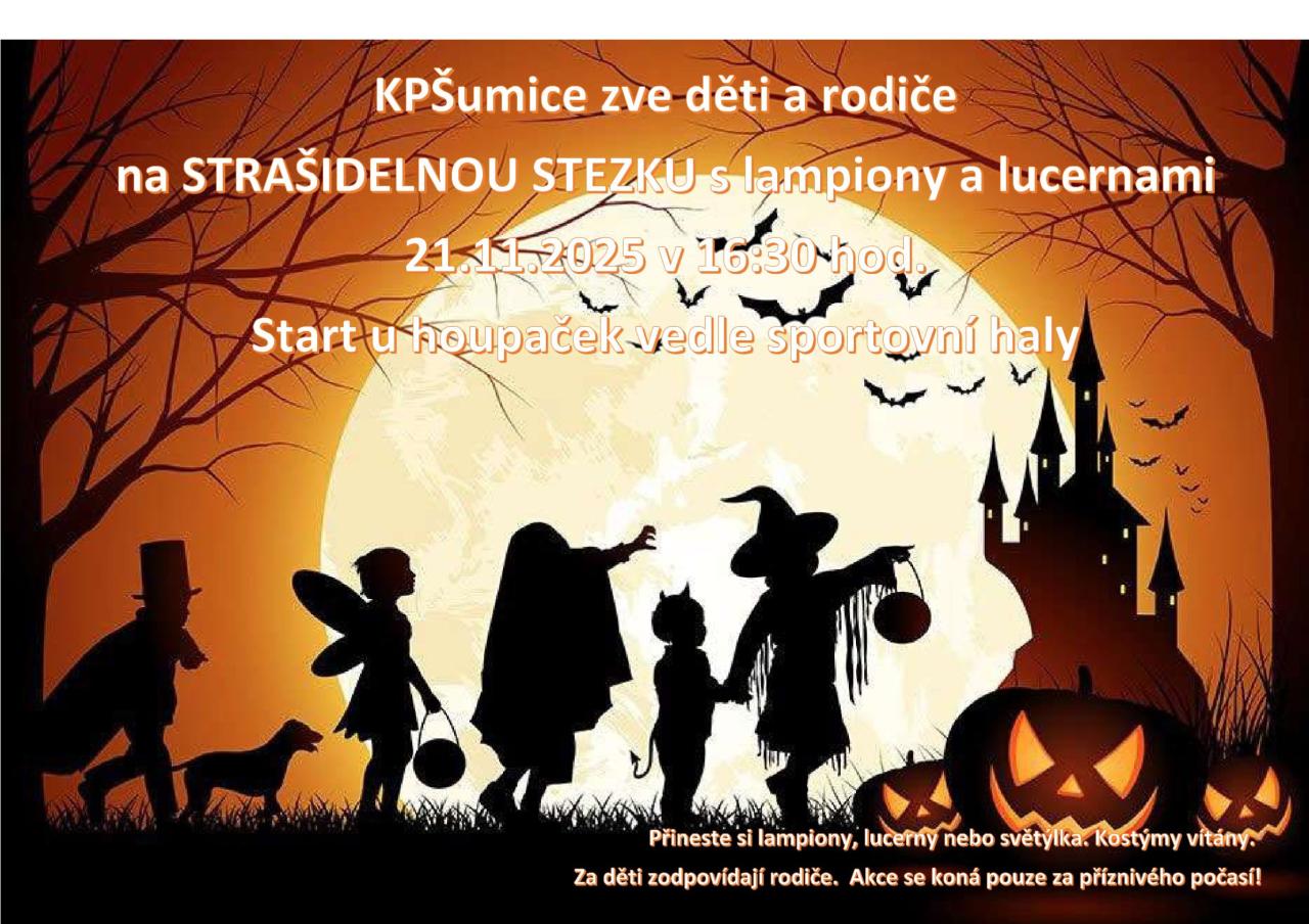 Klub přátel školy Šumice zve děti i rodiče na Strašidelnou stezku, která se koná 21. listopadu 2025 v 16.30 hod. v parku u dětského hřiště vedle sportovní haly. Děti si mohou přinést lampiony, lucerny či světýlka. Kostýmy jsou vítány. Akce se koná pouze za příznivého počasí.