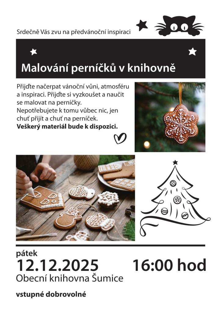 Srdečně zveme v pátek 12.12.2025 od 16:00 hod. do místní knihovny na ukázku zdobení perníčků. Přijďte si vyzkoušet a naučit se malovat na perníčky. Vstupné je dobrovolné.