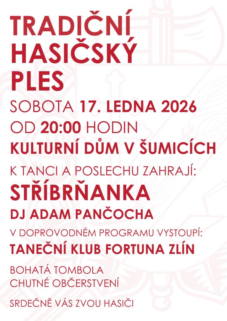 SDH Šumice srdečně zve 17.01.2026 od 20.00 hod. na Tradiční hasičský ples. K tanci a poslechu hraje dechová hudba Stříbrňanka a DJ Adam Pančocha. Dále budou k vidění ukázky společenských tanců v podání Tanečního klubu Fortuna Zlín. Připraveno je chutné občerstvení, skvělé víno a bohatá tombola.